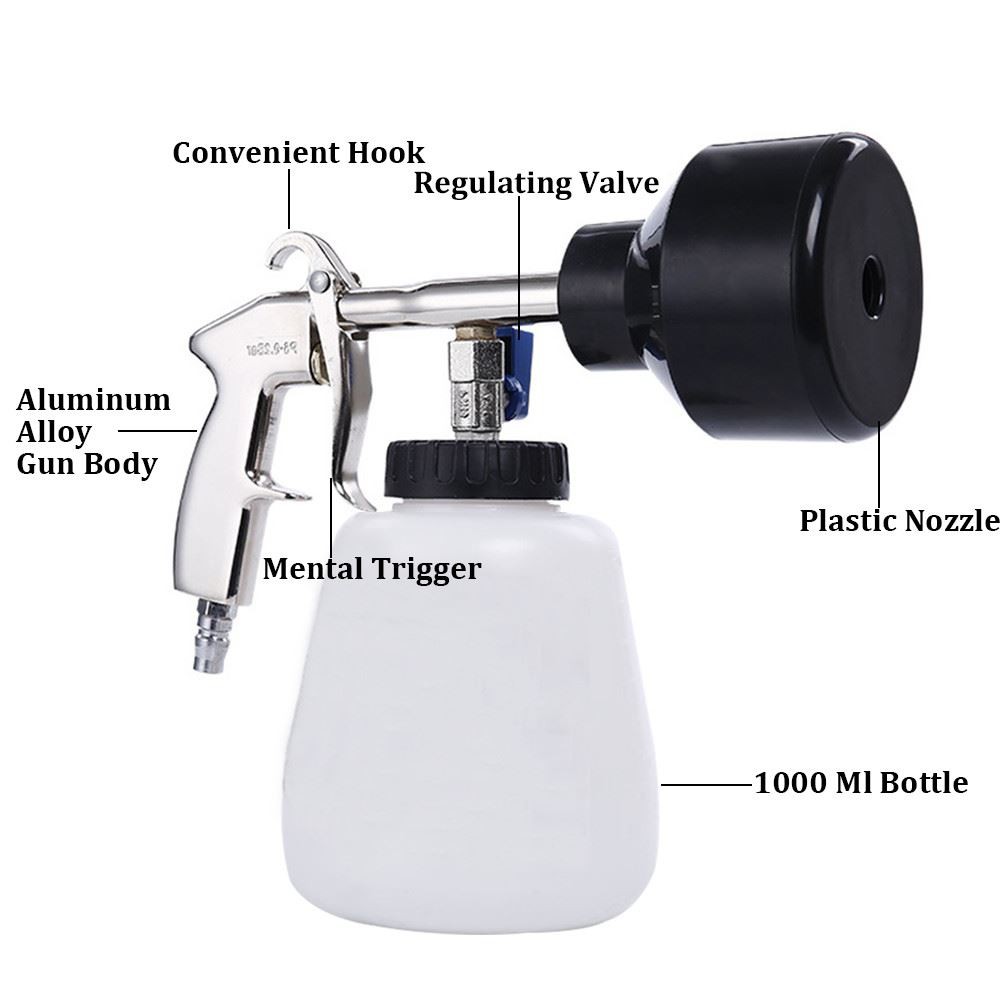 Tornador skumpistol kan sprøjte forskellige skumrensevæsker, der bruges til at rense bilens fnug og læder, motoroverfladen, dækoverfladen, bilens karrosseri og bilens instrumentbræt.